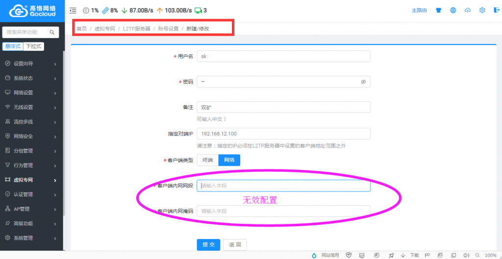 bug2:首页/虚拟专网/PPTP服务器或L2TP服务器/账号设置: 开启虚拟专网服务后,建立多个VPN账号,多个拨入的VPN账号主机之间缺少一条静态路由规则无法互通,需要手动添加才可以互通,见图2.1和2.2 解决过程见我发的另一篇帖子。http://www.gocloud.cn/bbs/forum. ... 9527&extra=page%3D1